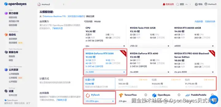 3.选择「NVIDIA GeForce RTX 5090」以及「PyTorch」镜像,按照需求选择「按量付费」或「包日/周/月」,点击「继续执行」。新用户使用下方邀请链接注册,可获得 4 小时 RTX 5090 + 5 小时 CPU 的免费时长!