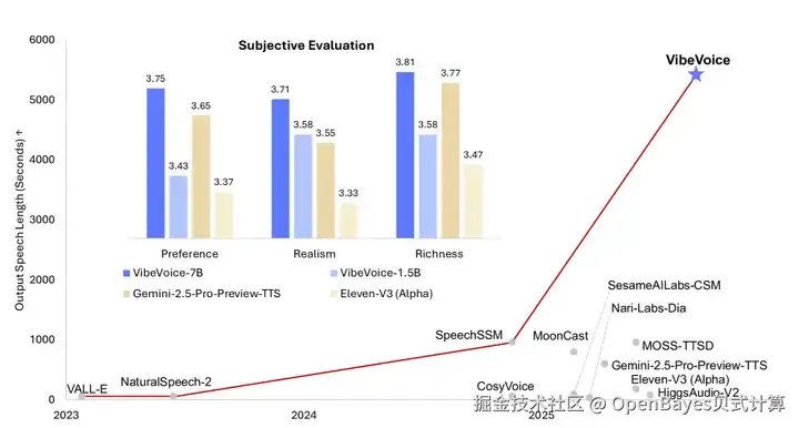 尽管架构简洁,VibeVoice 却展现出极强的能力,能够在 64K 上下文窗口中合成长达 90 分钟、包含最多 4 名说话人的语音, 音色更为丰富、语调更趋自然,并捕捉真实对话氛围,在跨语言应用中表现出更强的迁移能力,综合表现已超越现有的开源与专有对话模型。