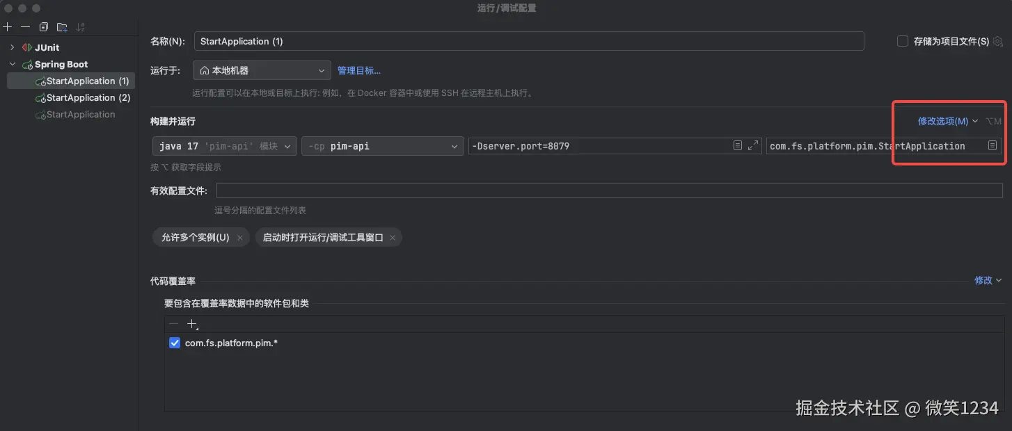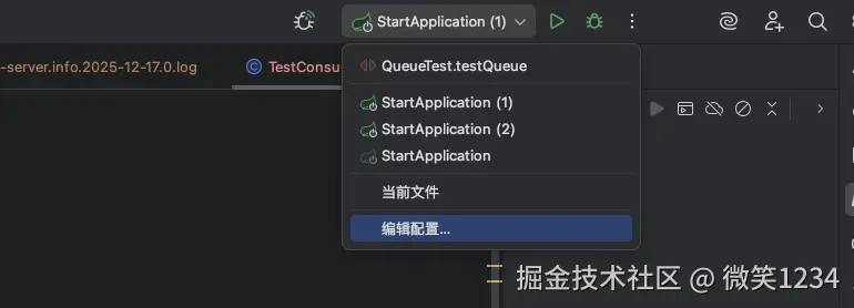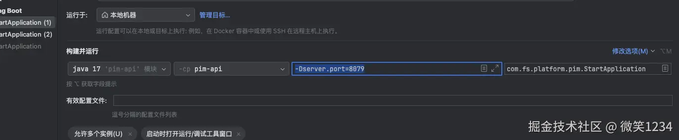 Spring Boot 项目,在 IDEA 中以不同配置同时启动多个实例 微笑1234 2025-12-19 52 阅读1分钟 IDEA版本 IntelliJ IDEA 2025.1.2 (Ultimate Edition) 操作步骤 编辑配置 修改选项 添加选项 允许多个实例 添加虚拟机选项 设置虚拟机选项 -Dserver.port=8079 服务启动 点击运行配置 选择Springboot