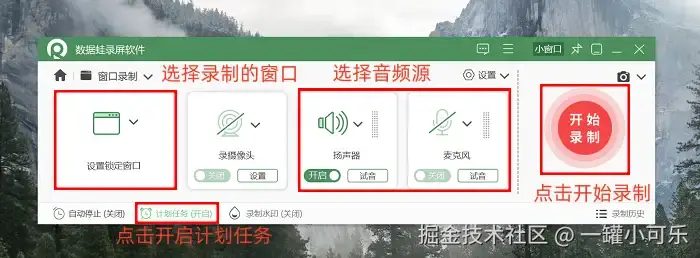 第二步:选择录制模式后,软件将自动切换到准备设置页面。用户可在此按需调整录制区域和音量大小,若有设置录制停止时间的需求,可点击下方 【计划任务】 进行配置,全部设置妥当后,点击 【开始录制】 启动操作;