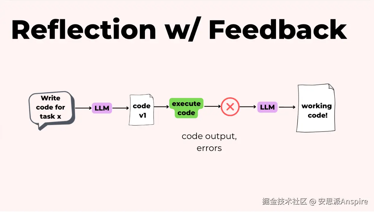 反射在代码中变得非常强大,因为你可以添加外部反馈。你可以编写代码,让一个审查代理对其进行审核,然后实际运行它。这使你能够捕捉错误、测试结果和输出,并将这些反馈给模型。模型可以利用这些具体信息生成更好的版本2。