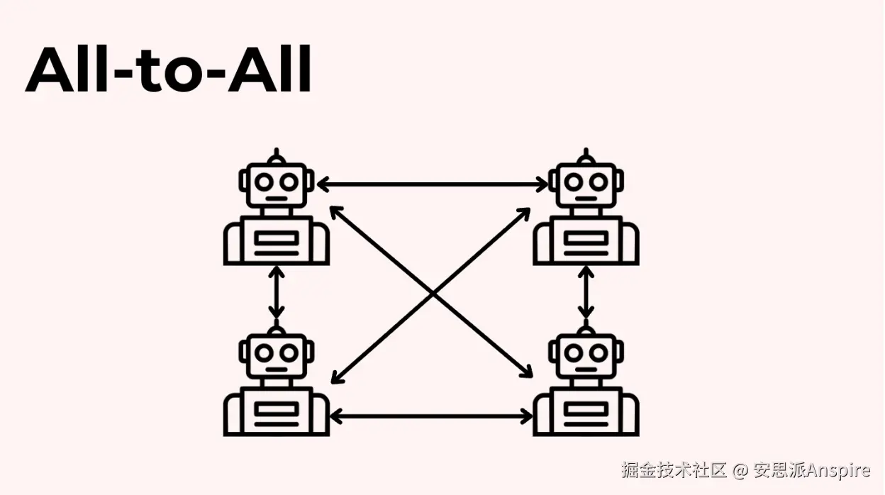 最后,我们有全连接模型,它可能会超级混乱。在这个模型中,任何智能体都可以在任何时候向其他任何智能体发送消息。这种情况在实际生产中很少见,因为它难以预测和控制。每次运行的输出可能会有很大差异。