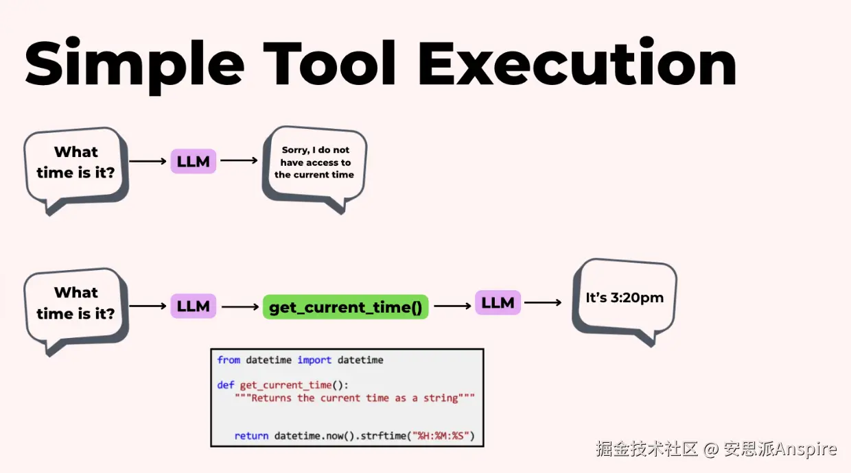 这很重要,因为大语言模型本身只是一个文本生成器。它不知道现在是什么时间,也不了解贵公司的销售数据。它无法执行代码来计算确切答案。