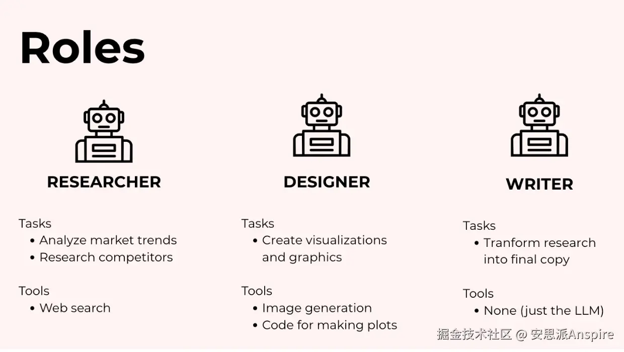 你通过为每个智能体设定一个角色来实现它,比如“你是一个专门从事市场分析的研究智能体”,并仅为其提供该角色应具备的工具。