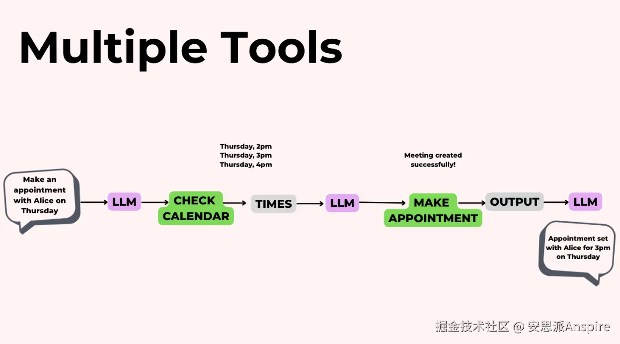 当你为模型提供多个工具时,它可以将这些工具串联起来使用。例如,假设你正在构建一个日历助手。你已经公开了三个工具:checkCalendar(检查日历)、makeAppointment(创建预约)和deleteAppointment(删除预约)。