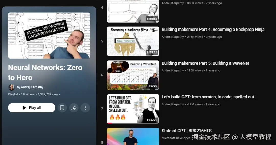 一些教学视频也很有用,可以作为预热,让心里有一个大概的印象,一个比较好的资源是Andrej Karpathy,其中包含了大量「从零开始解释大型语言模型」的教学视频。