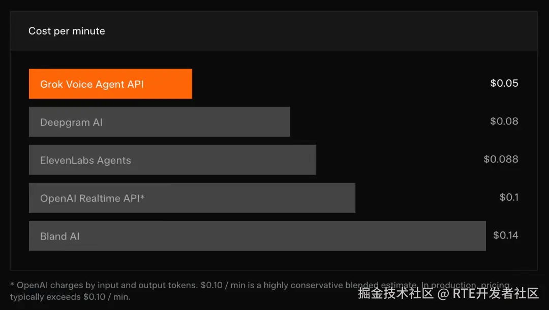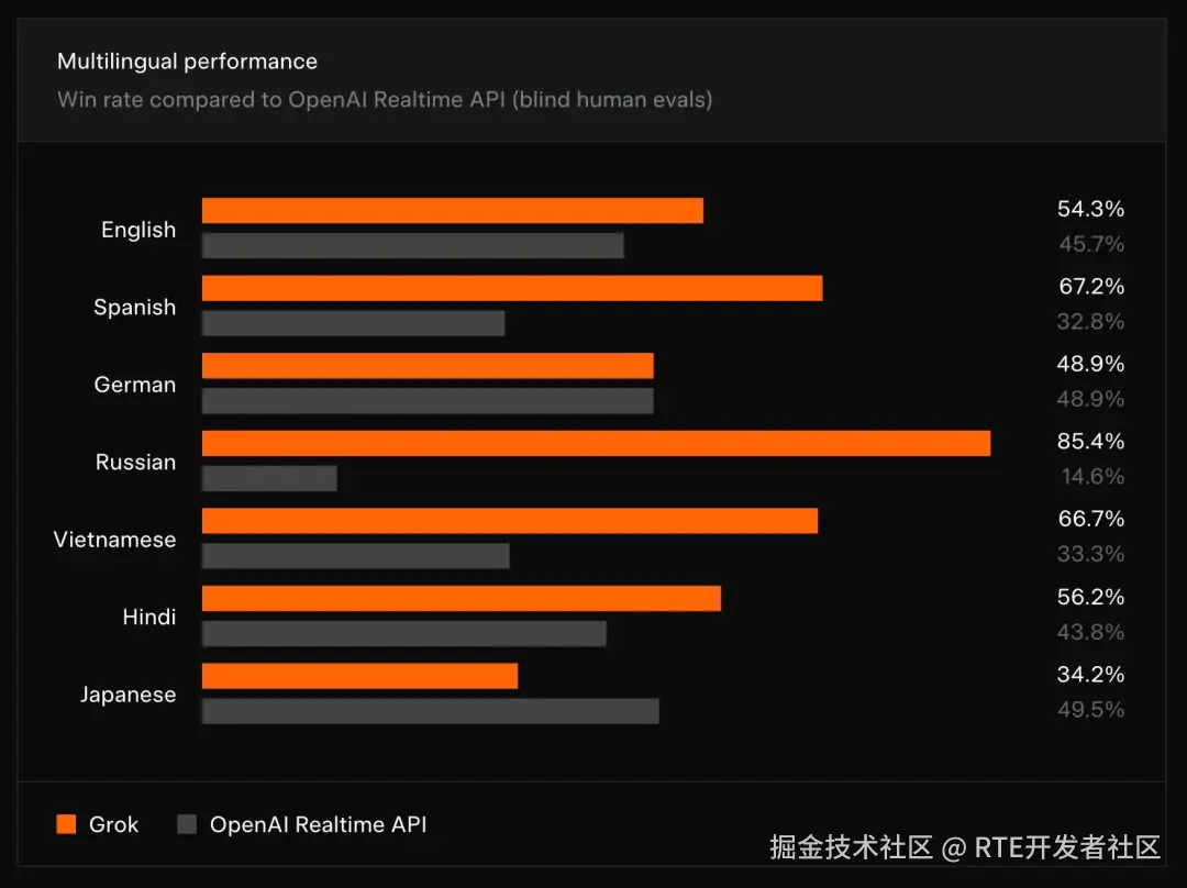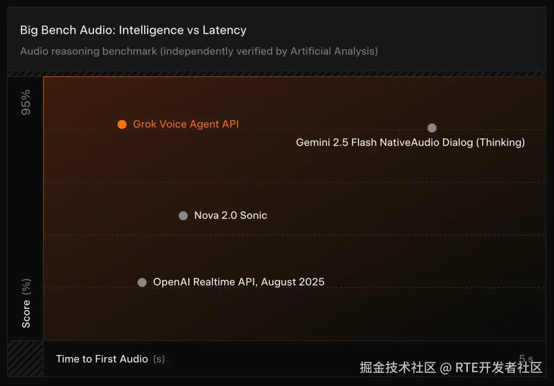 - Big Bench Audio 评测第一:Grok Voice Agent API 在独立验证的 Big Bench Audio 评测中得分 95%,显示其在音频推理方面的领先能力。