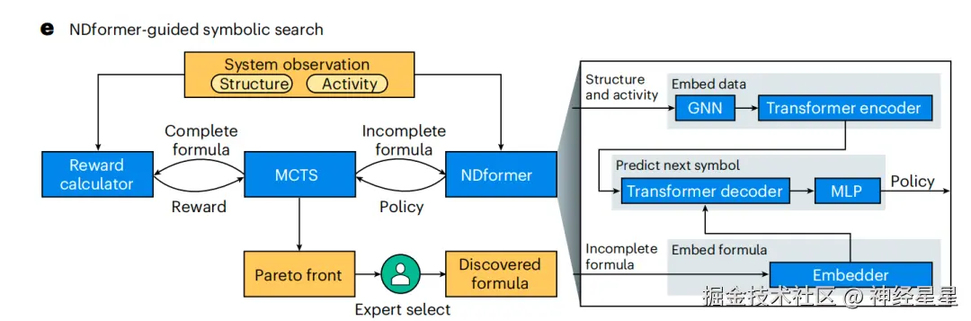 此外,由 NDformer 引导的符号搜索算法通过结合神经网络与符号搜索方法的优势,显著提升了公式发现的效率与准确性。该算法由负责搜索的符号模块和负责引导的神经模块共同组成, 如下图所示。神经模块 NDformer 学习捕捉系统潜在动力学的隐含特征,并估计构成公式所需各个符号的概率分布;符号模块 MCTS 则依据 NDformer 预测的概率来选择符号,从而构建候选公式。