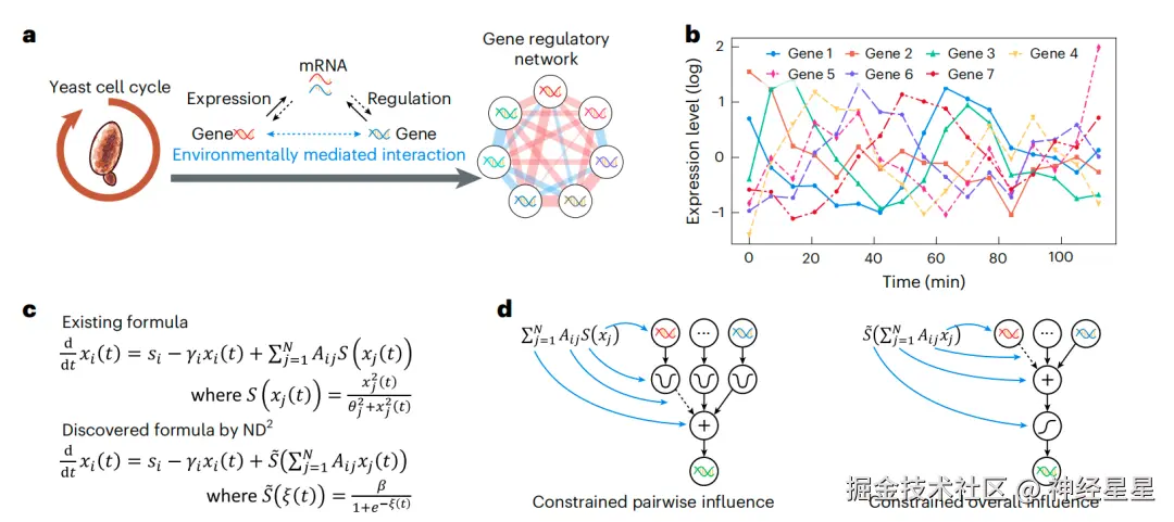 在酵母细胞的分裂周期中,基因之间由环境介导的调控关系可以用一个全连接网络来描述(图 a)。基因表达水平(以表达的 mRNA 数量的对数来衡量)作为网络中各节点的活动量(图 b)。从聚合算子与非线性算子的作用顺序角度,对现有公式与修正后公式进行比较(图 c),并展示二者在算子结构上的差异(图 d)。