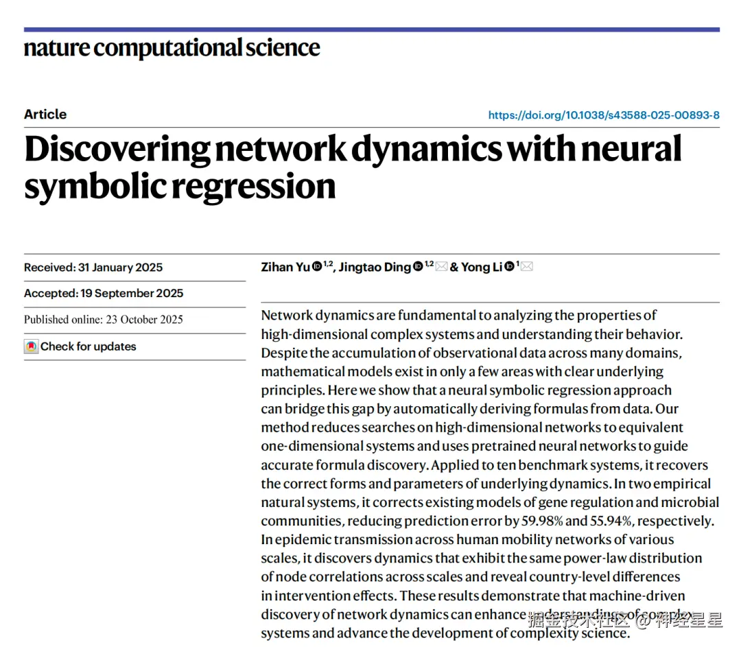 相关研究以「Discovering network dynamics with neural symbolic regression」为题,已发表于 Nature Computational Science。
