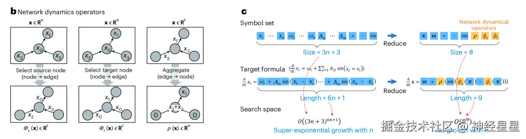 如下图所示,网络动力学算子包含源算子 φ(s)、目标算子 φ(t) 和聚合算子 ρ,这些算子使网络动力学公式的表达不依赖于网络规模,从而将原本随网络规模指数增长的搜索空间压缩成与维度无关的一维问题。