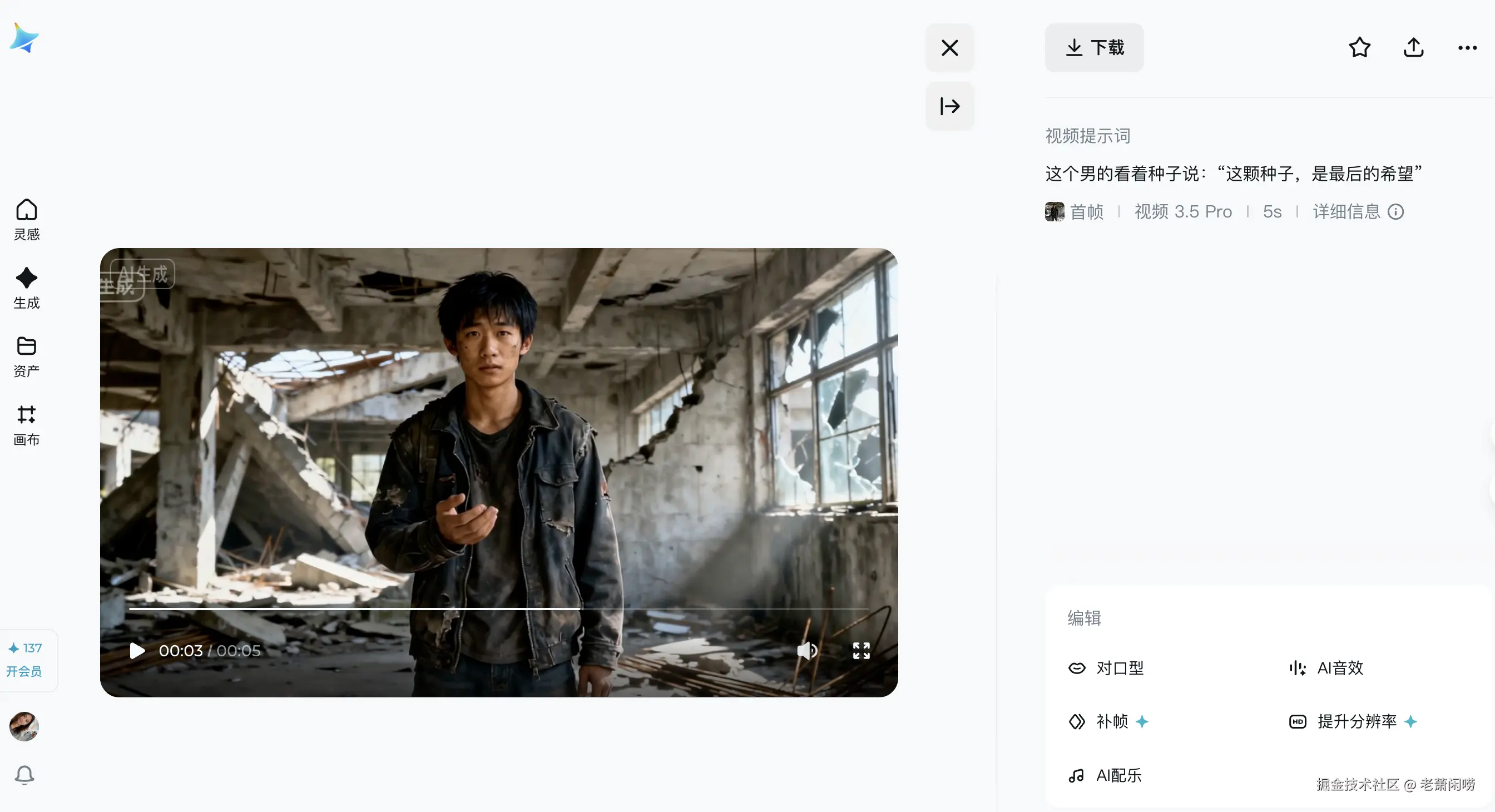 - 操作: 选中刚才的图,点击“生成视频”。选择 “视频 3.5 Pro” 模型。