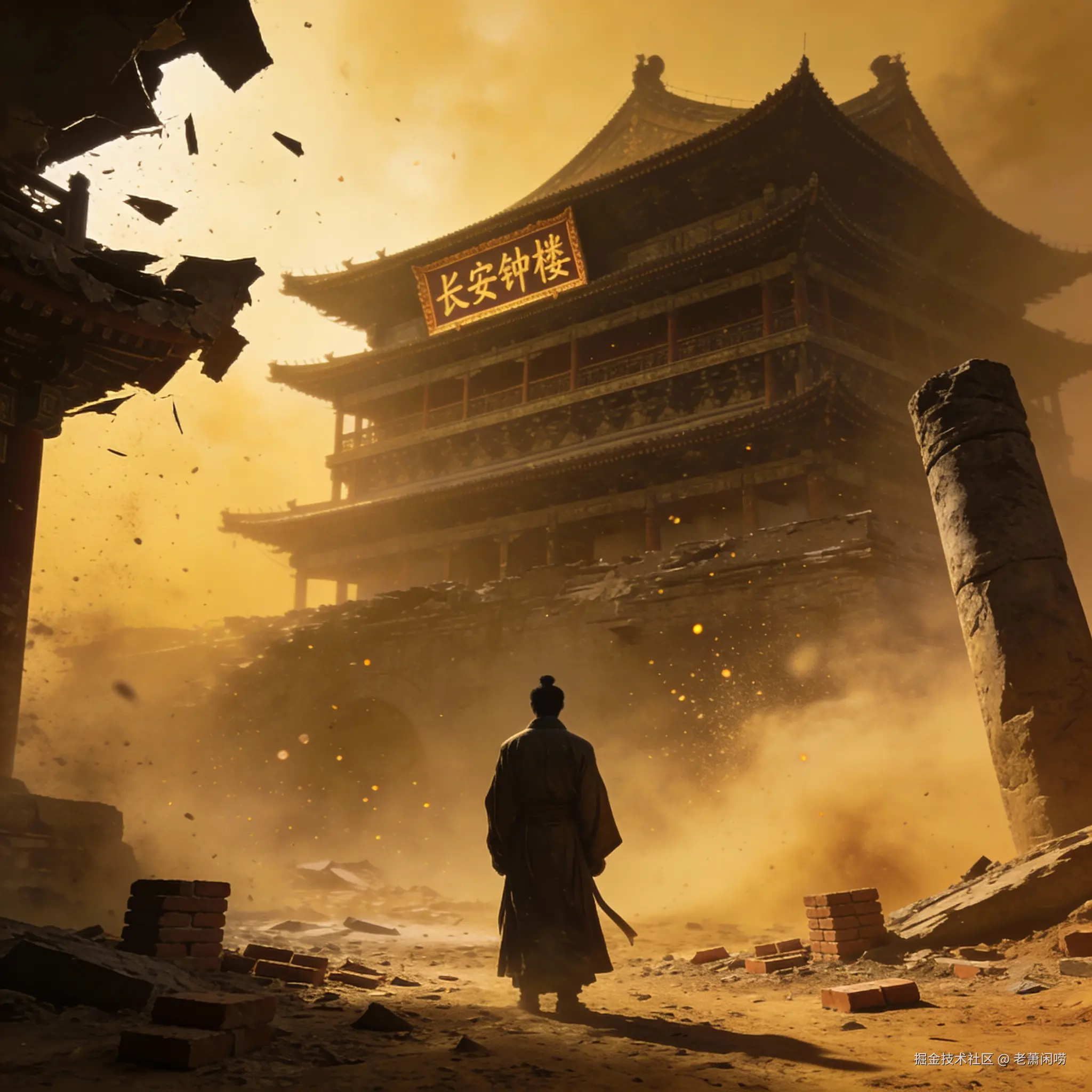 - 提示词: “电影级镜头,2088 年长安钟楼废墟,古风结合,沙尘暴天气,前景是一个穿着汉服的男子背影,孤独感,王家卫光影。”