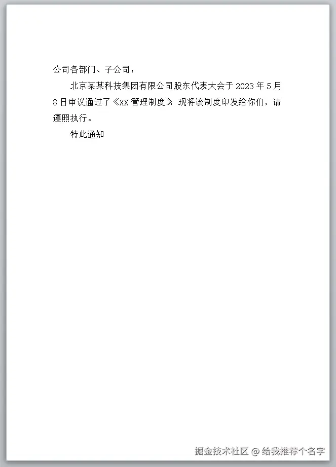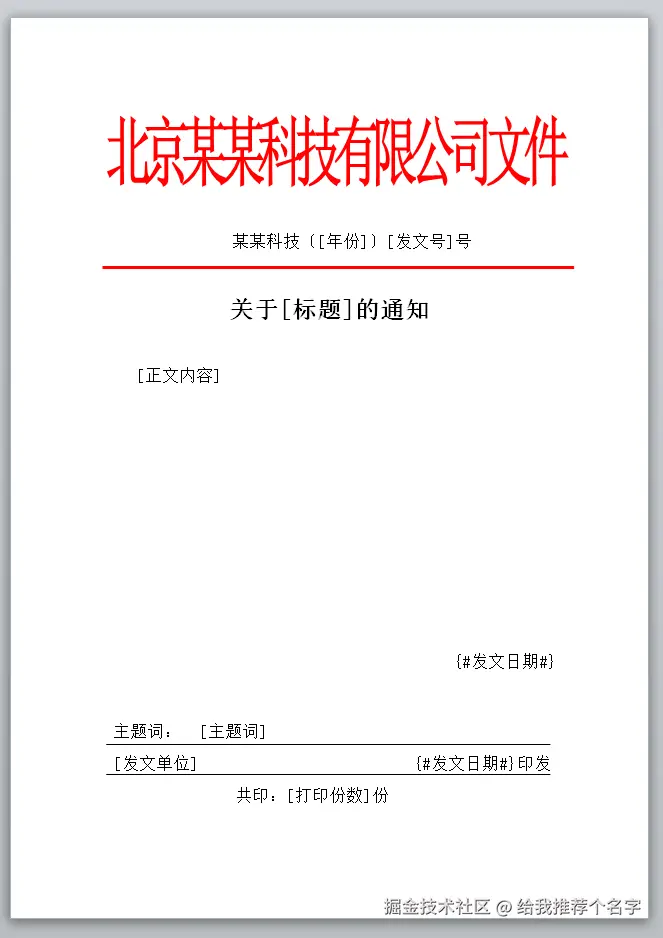 用户选择通知模板,对文件进行套红。假如通知模板文件为:template_tongzhi.docx,模板内容和样式如下图所示。