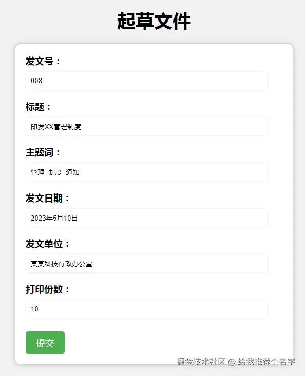 - 一般情况下,一个Web项目的文件起草模块都会给用户提供一个起草文件的表单让用户填写,用户提交保存后,创建新文件的同时,还会把这些数据保存到数据库中作为文件的关联属性数据。比如开发人员在Web系统中开发的起草通知功能是这样的:给用户提供了一个起草文件的页面(以下图为例),让用户填写各项表单数据,并点击“提交”按钮后,就会在项目的数据库中添加新的文件记录,同时创建一个空白的通知文件(比如文件名为“ZhenWen.docx”),并让用户在线打开此文件,编辑通知的正文内容。