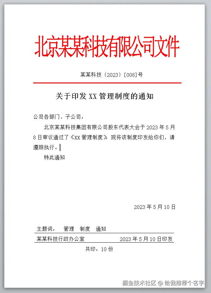- 编辑文件正文后,使用模板对文件套红。文件经过起草编辑正文、领导审阅、核稿等环节后,确认了正式的文件正文内容(此时文件中还没有红头),将文件正文内容套入到红头模板中,生成正式的文件。