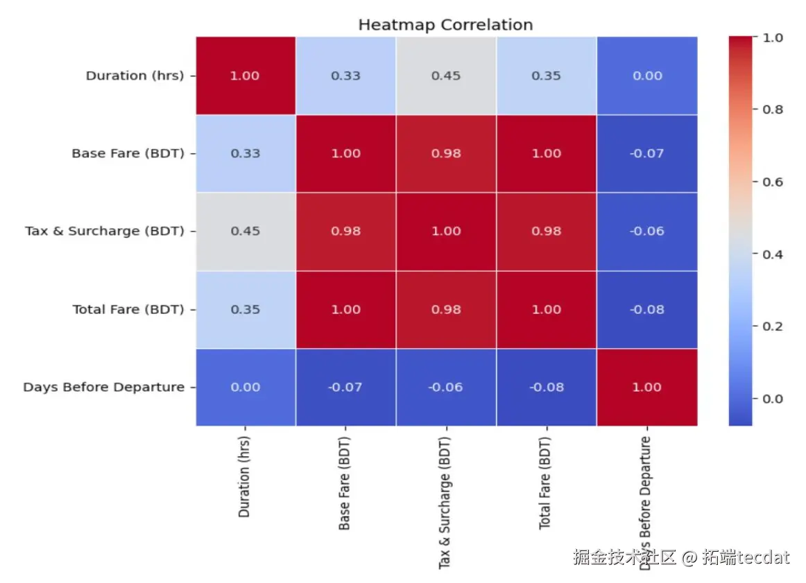 结果显示,基础票价(Base Fare)与总票价(Total Fare)呈强正相关(相关系数0.98),验证了“基础票价是总票价核心组成”的业务逻辑,为后续特征选择与模型构建提供了依据。