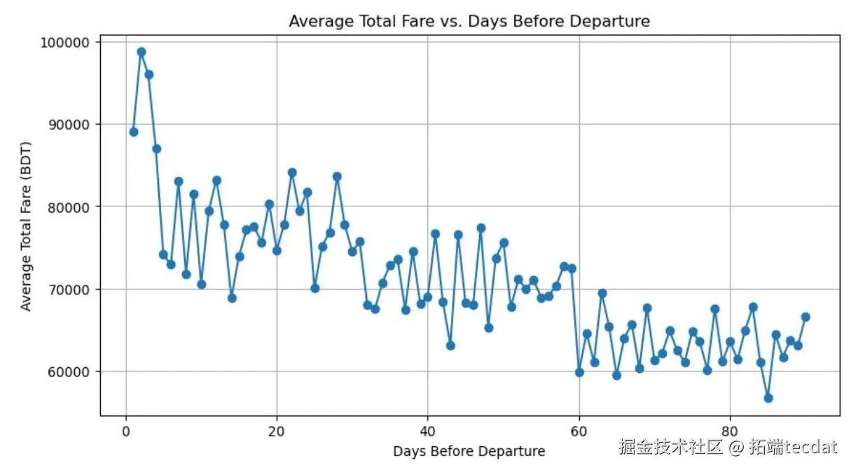 分析师按“离出发前天数”对数据分组计算平均票价,通过折线图呈现两者变化趋势: