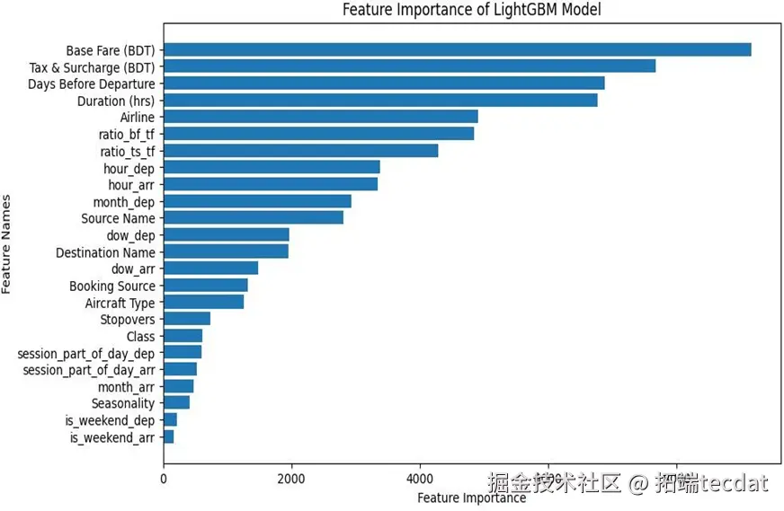 通过LightGBM的feature_importances_属性提取各特征对票价预测的贡献度,可视化结果如下: