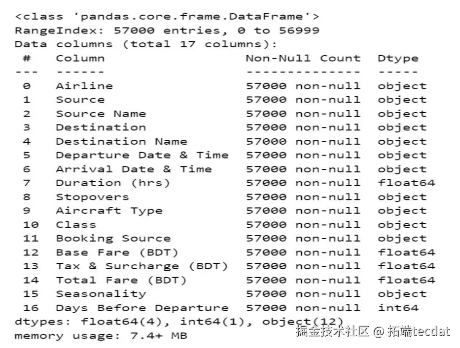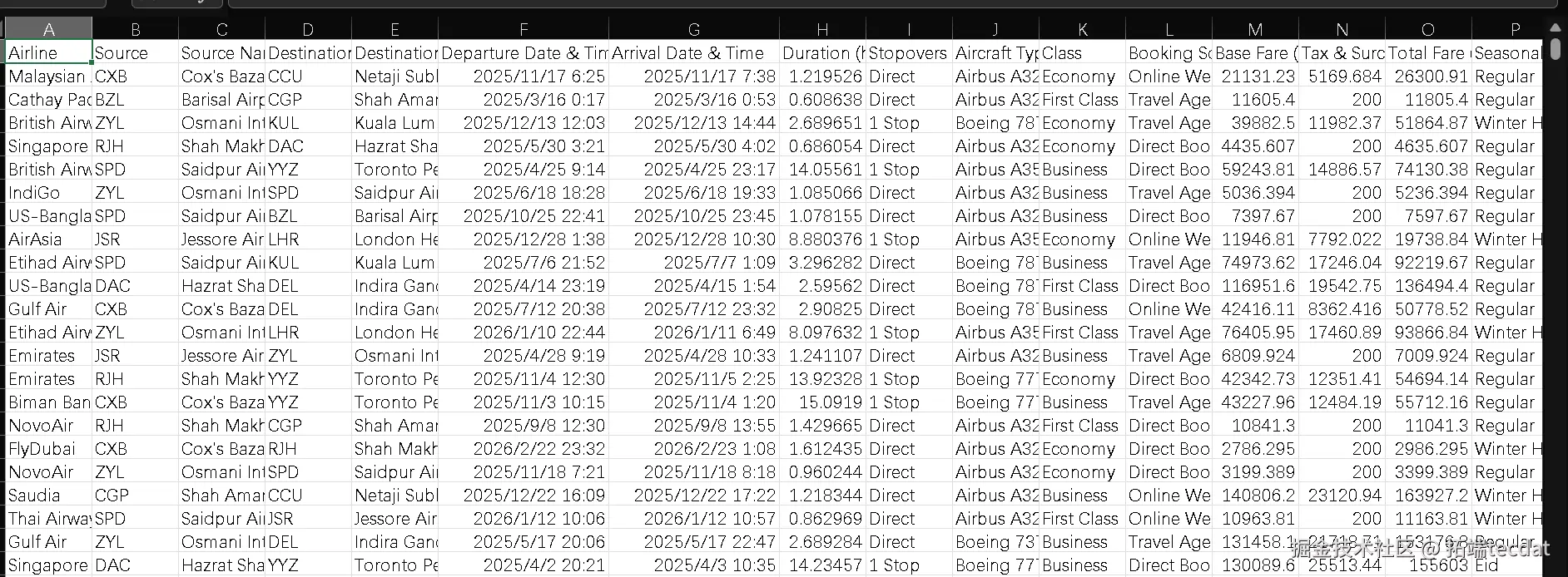 本研究使用的航班票价数据集包含57000条记录,涵盖17个特征,核心字段包括航空公司、出发/到达机场、飞行时长、经停次数、票价构成(基础票价、税费)、购票时间、出行季节等。数据集详细说明如下:
