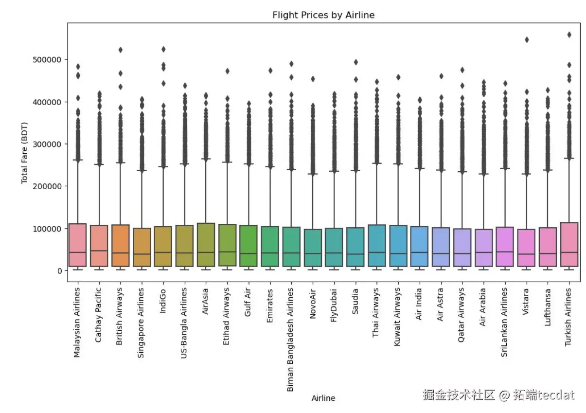 通过箱线图对比不同航空公司的票价分布,清晰呈现中位数、四分位数范围及异常值: