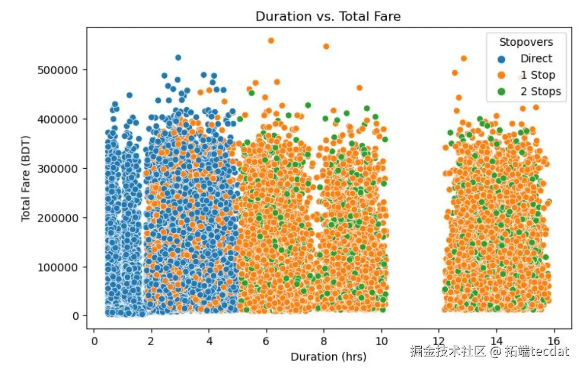 以飞行时长为横轴、总票价为纵轴,用颜色区分经停次数绘制散点图,分析三者相关性:
