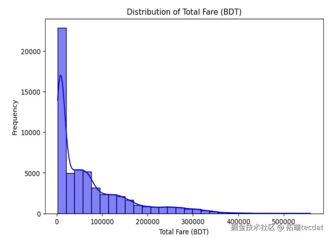 总票价呈现明显的右偏分布:多数航班票价集中在低位区间,高价票占比少但存在显著差异。这一分布特征符合航空市场定价逻辑——低价票满足大众基础出行需求,高价票对应高端舱位或长航线服务,为后续模型处理极端值提供了参考。