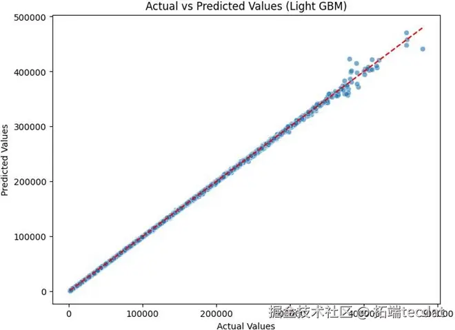 从散点图可观察到,多数散点紧密贴合参考线,表明模型能有效捕捉票价核心影响规律,预测值与真实值偏差合理;低、中票价区间预测效果优异,高票价区间虽存在少量偏离,但整体离散度可控。模型最终MAPE误差仅为0.37%,说明经Optuna优化后的LightGBM模型对航班票价具有极高的预测精度,能满足实际业务需求。