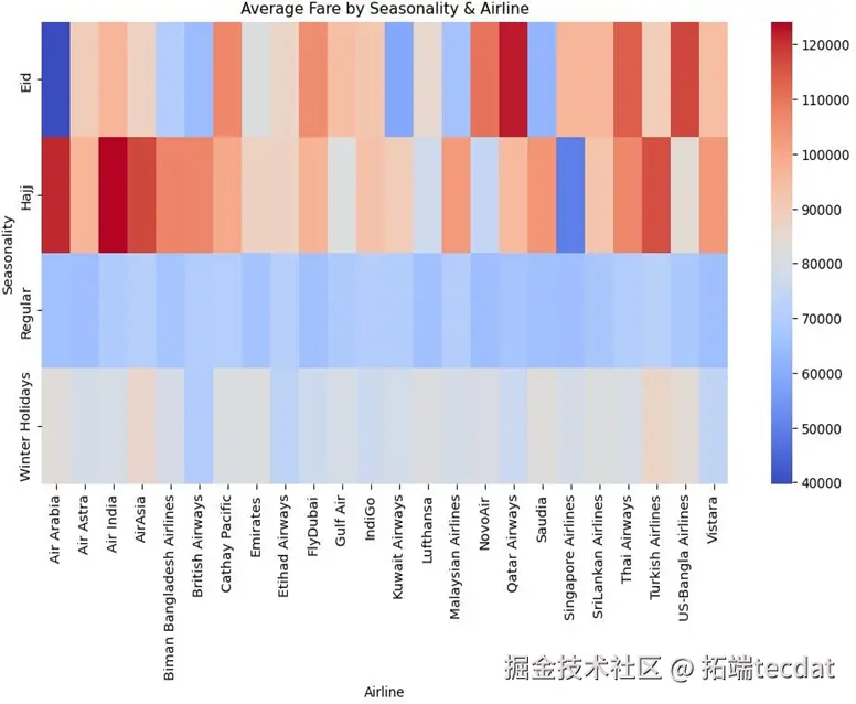 - 季节性分层显著:宗教节日(Eid、Hajj)期间多数航司票价显著溢价(热力图深红色),常规季节票价整体偏低且趋同(蓝色),冬季假期票价介于两者之间;
