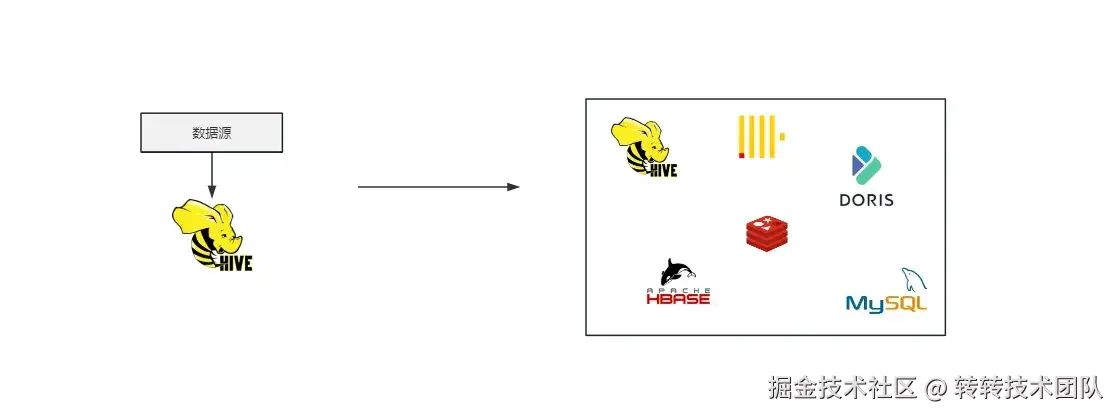- 过去已经完成了Hive元数据的对接和整个链路搭建,但是业务数据存放在各个存储介质上,目前转转会将大部分T+1离线数据存放到Hive上面,实时任务会存到doris、ck、redis、hbase上面,极少数据会放到mysql