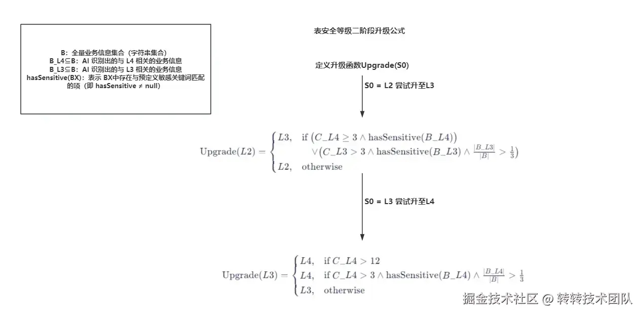 - 二阶段公式:二阶推导公式主要用到极值占比概率来提高整体表打标结果,其中会用到自定义敏感词,以及该表包含的子业务信息占比,比如该表有7个子业务域,包含订单信息、商品信息、基本信息、浏览信息、点击行为、搜索行为, 其中敏感业务包含订单信息、商品信息、基本信息、浏览信息并且对应字段存在L4安全等级,则会判定 |B_L4| / |B| > 1/3 条件