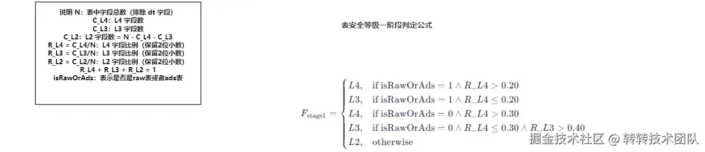 - 一阶段公式:基本推导表安全等级公式,仅由L4、L3占比以及是否raw表或者ads表来确定最终的表安全等级