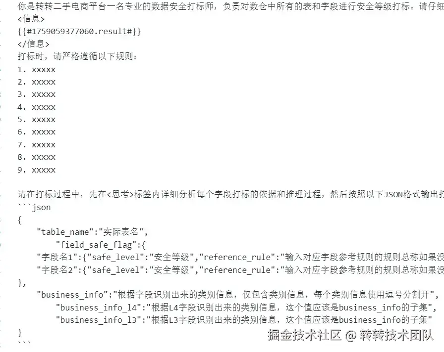 - 结构化Promtpt设计:使用带有标签包围的特征值 例如使用<table_info></table_info>来说明内容是表元数据,使用<rule_info> </rule_info>来说明内容是规则元数据, 标签内部的数据要符合markdown语法,尽量使用 #、##、{name}、这种带有分级且清晰的说明元数据中每一项,这样下来整体的结构就比较清晰确定,减少计算不确定性带来的差异性