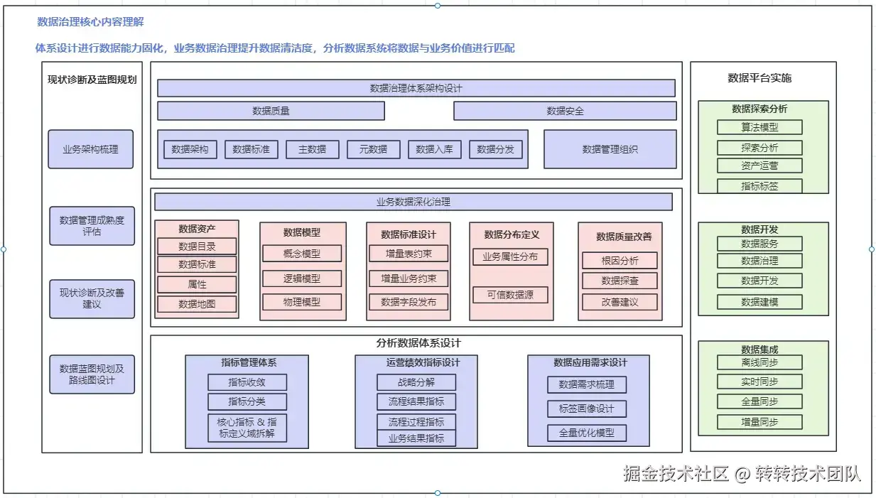 对于数据治理核心内容可概括为三块内容:数据治理体系设计、业务数据深化治理、分析数据体系设计