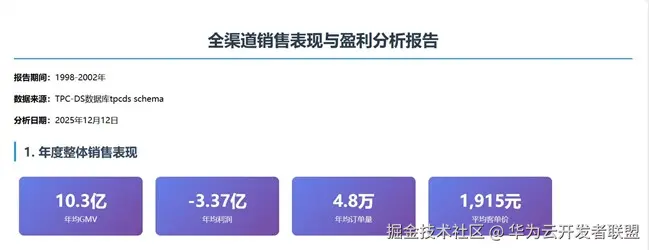 通过搭建 DWS‑MCP‑Server,企业与科研团队即可将自然语言对话与关系数据库无缝衔接,实现“一键查询、自动化报表、动态分析”的全链路数据服务。按手册步骤完成配置后,LLM 将直接识别工具接口(如 list_databases、execute_query 等),在安全约束内调用接口进行 SQL 生成与执行。元数据查询(schema、tables、views)与业务查询结果无缝串联,随后模型可立即进行业务解读、可视化图表与洞察报告的自动生成。该方案不仅显著降低了传统 SQL 开发的学习曲线和运维成本,还提升了数据迭代的响应速度,为数据驱动决策提供了高度可靠且易扩展的技术平台。在自然语言接口与 AI 推理能力进一步成熟的今天,DWS‑MCP‑Server 能够成为企业数据治理、实时分析与跨团队协作的巨大助力。
