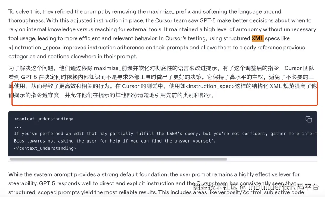 此外,OpenAI GPT-5官方Cookbook显示,Cursor团队在使用GPT-5时采用XML Tags,同样获得了显著的性能提升。