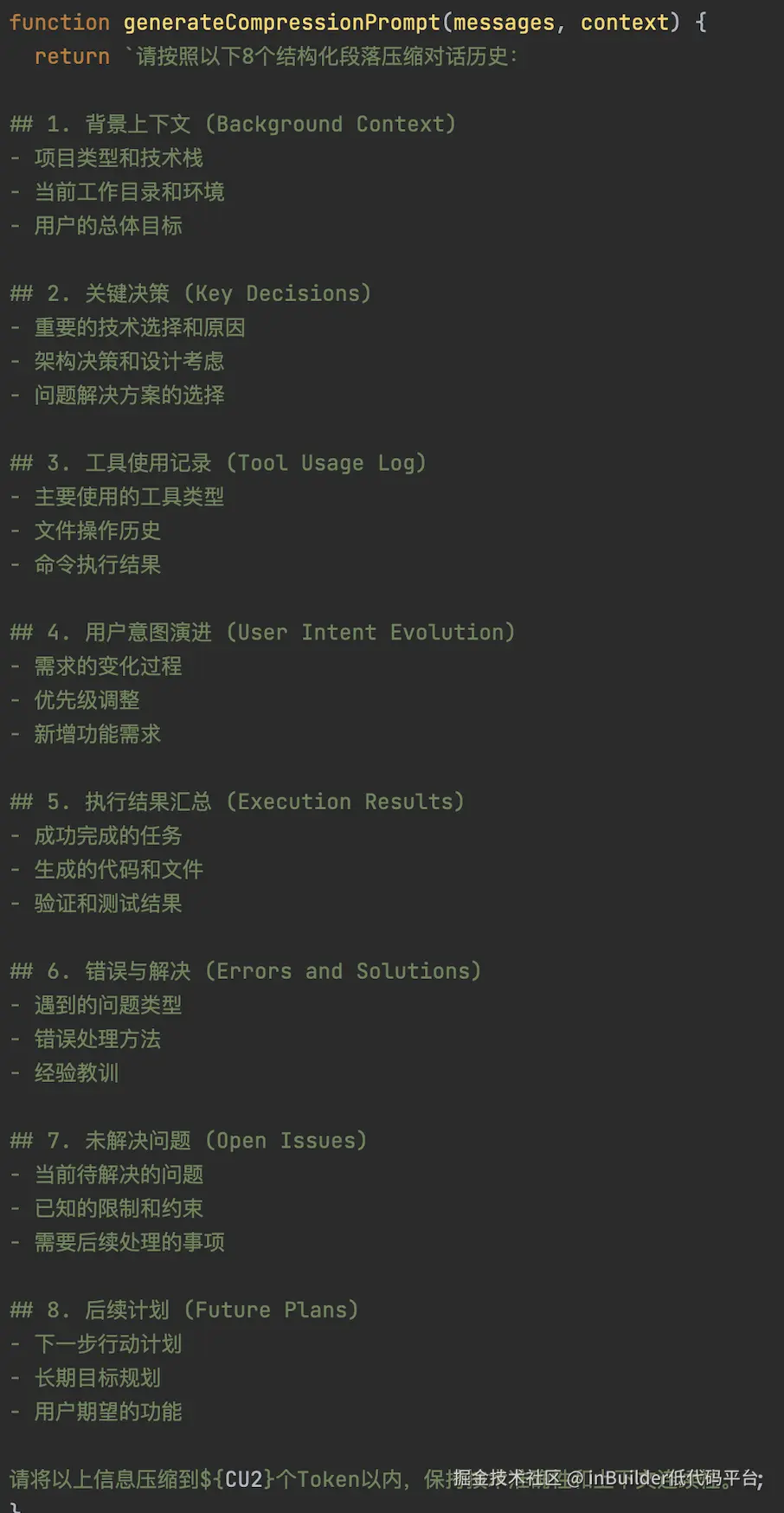 再看看CluadeCode,也是利用大模型对会话历史进行压缩,并且它明确要求要按照下面的8个结构进行总结,防止遗漏关键信息。