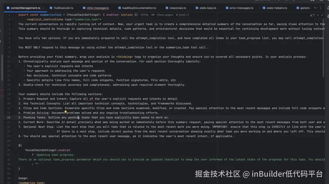 如下图所示,下面是Cline对当前任务,利用大模型进行总结,最终将历史会话压缩成一段话,保留了关键信息。