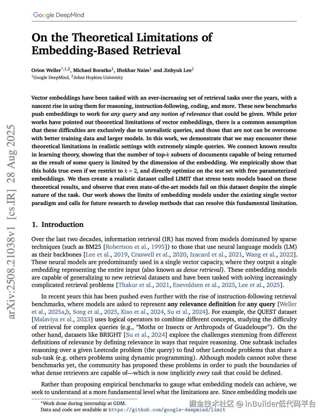 Google最新研究论文表明,向量召回的性能存在上限:其核心论点是:对于任何给定的嵌入维度(embedding dimension),模型能够检索到的相关文档组合(top-k subsets)数量有限。这意味着,随着检索任务日益复杂(例如指令组合不同概念),现有模型将不可避免地遇到无法表示的文档组合。因此,研究界需要探索更具表现力的检索方法来突破这一瓶颈。