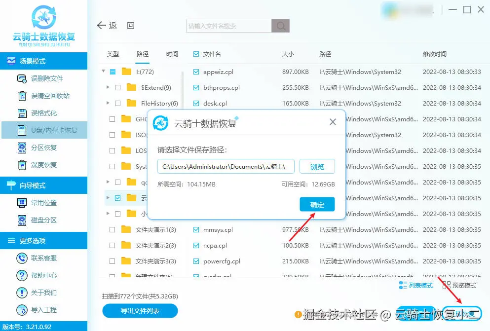 扫描完成后,可通过“列表模式”中的路径方式快速定位已删除的文件夹,并通过“预览模式”预览文件内容。