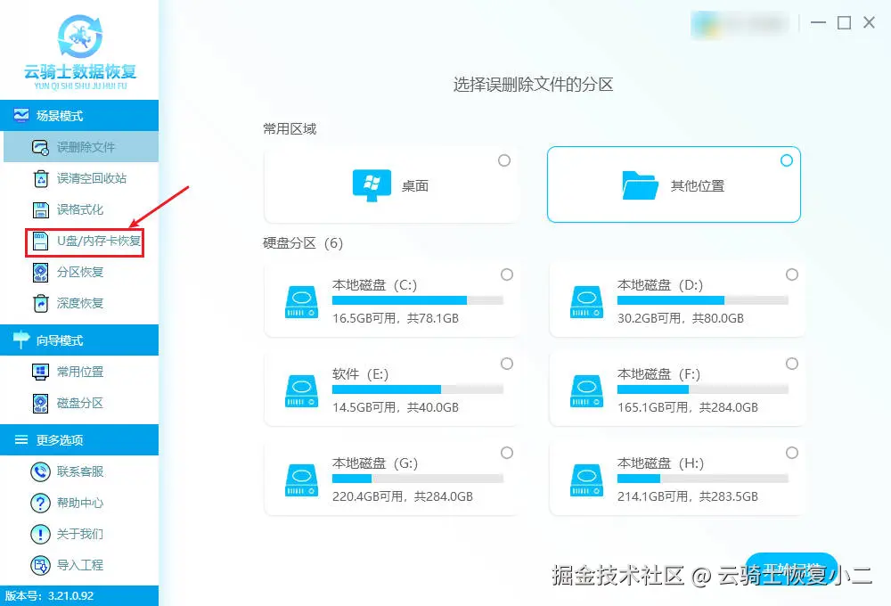 启动已提前在电脑上下载安装好的软件后,在主界面选择 “U盘/内存卡恢复” 模式。