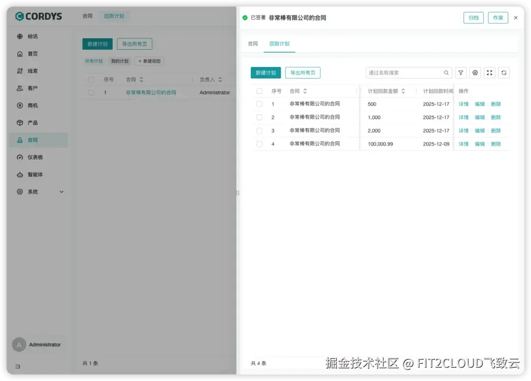 Cordys CRM v1.4.0版本的合同模块下新增回款计划功能。用户可以在合同模块中创建并查看回款计划。在未来,Cordys CRM还计划增加回款模块,当在回款模块中进行认款后,回款计划会自动更新计划状态。