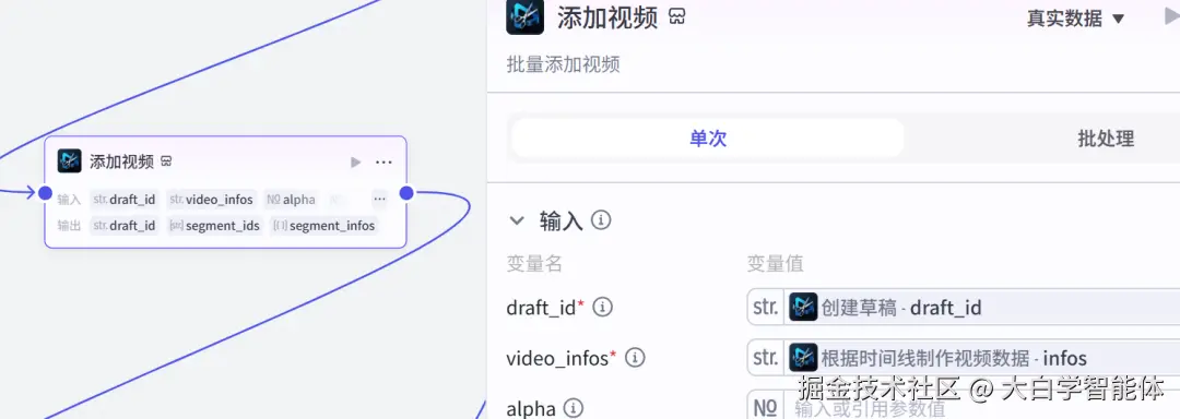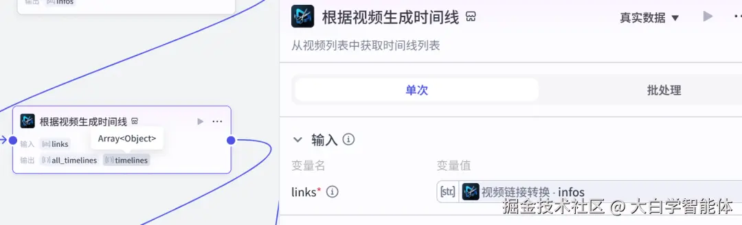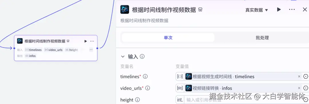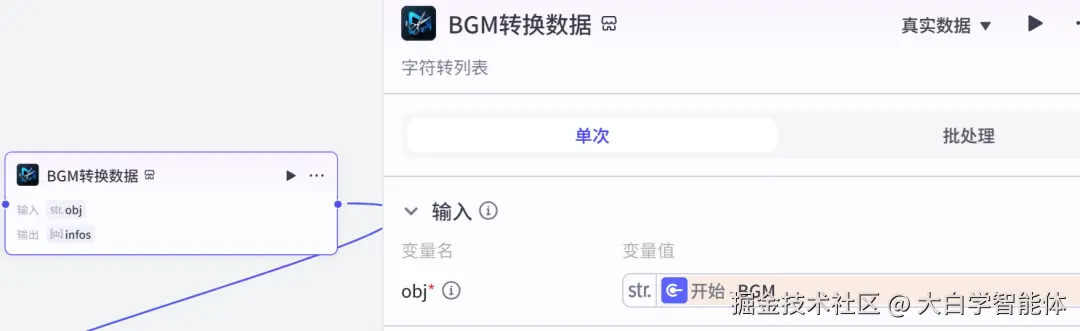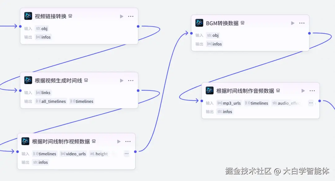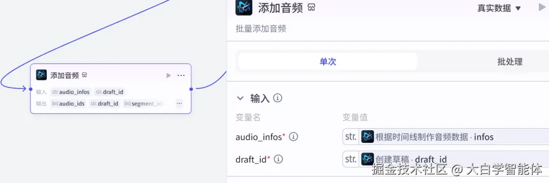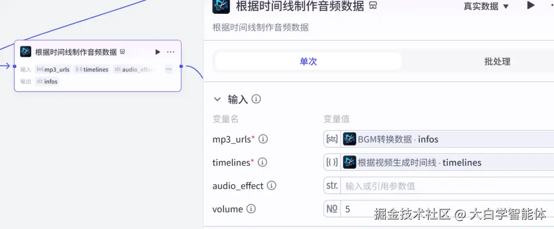 使用str_to_list将音频数据转换成字符串列表格式,方便后续节点使用。使用audio_infos创作音频数据,它的时间线就是视频的时间线。