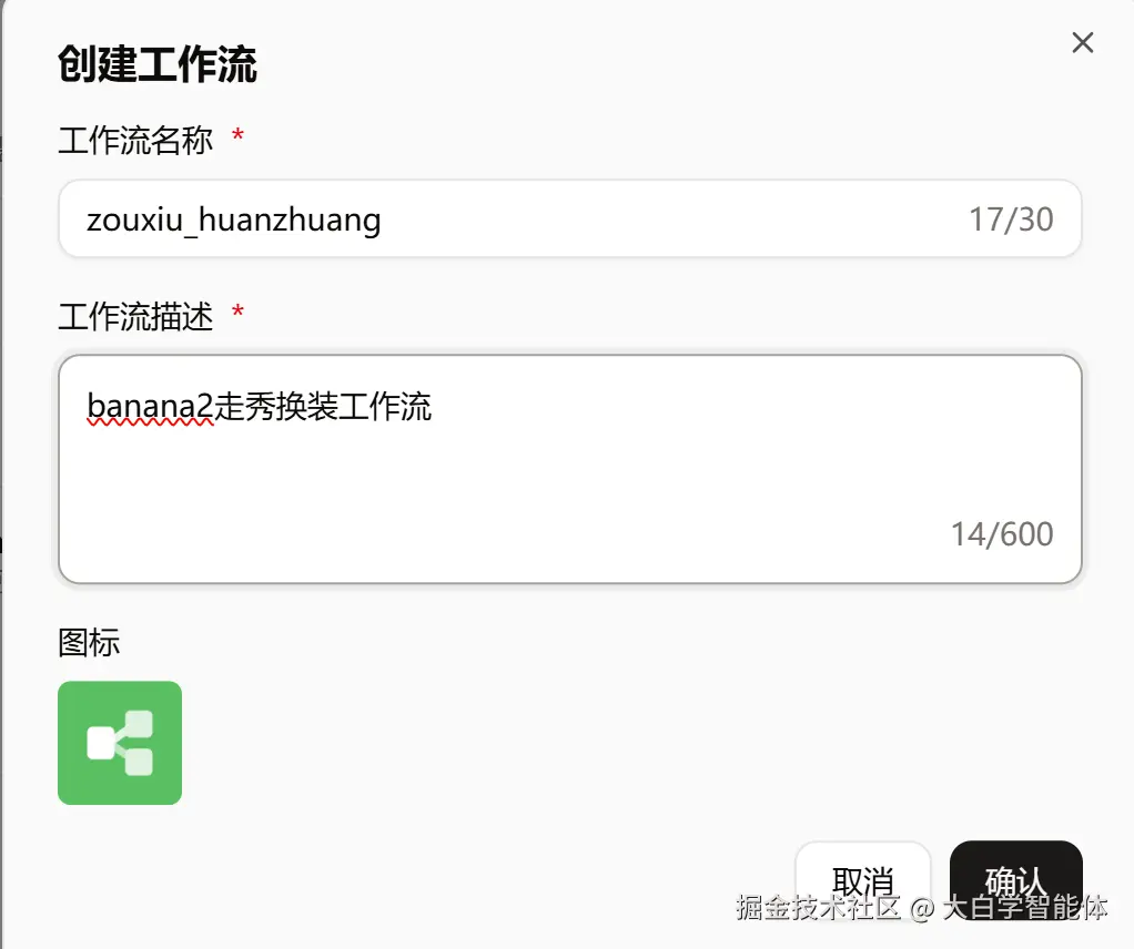 3、点击 “工作流”,填写工作流的名称和描述,名称只能用英文或拼音,我一般用拼音表示。
