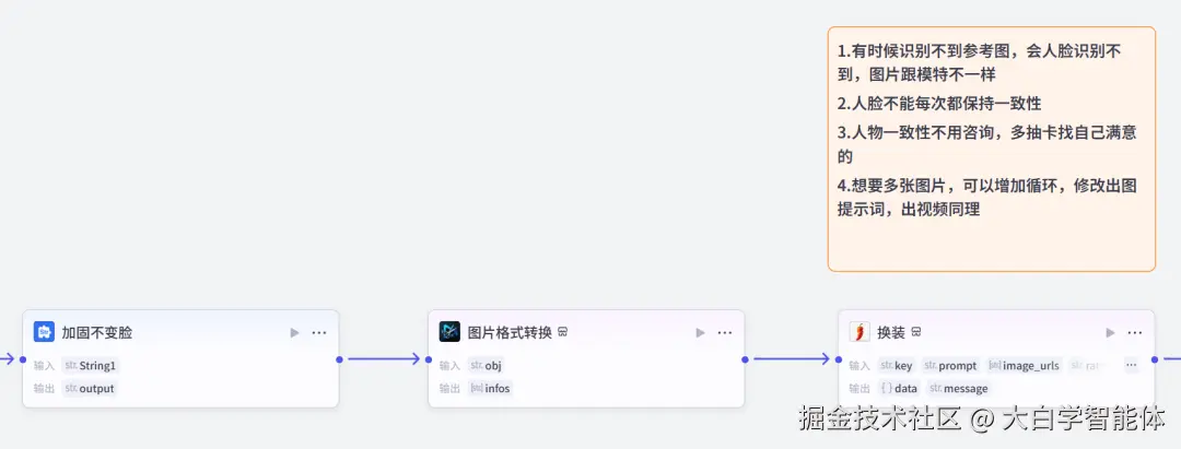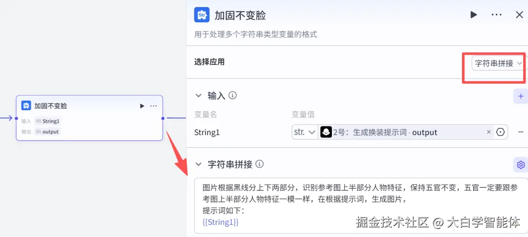 使用【文本处理】节点的字符串拼接功能,再次强调五官要和上半部分的人物特征一模一样。4.2 参考图列表化