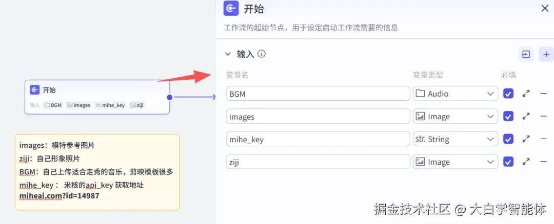 开始节点需要设置4个变量,分别如下