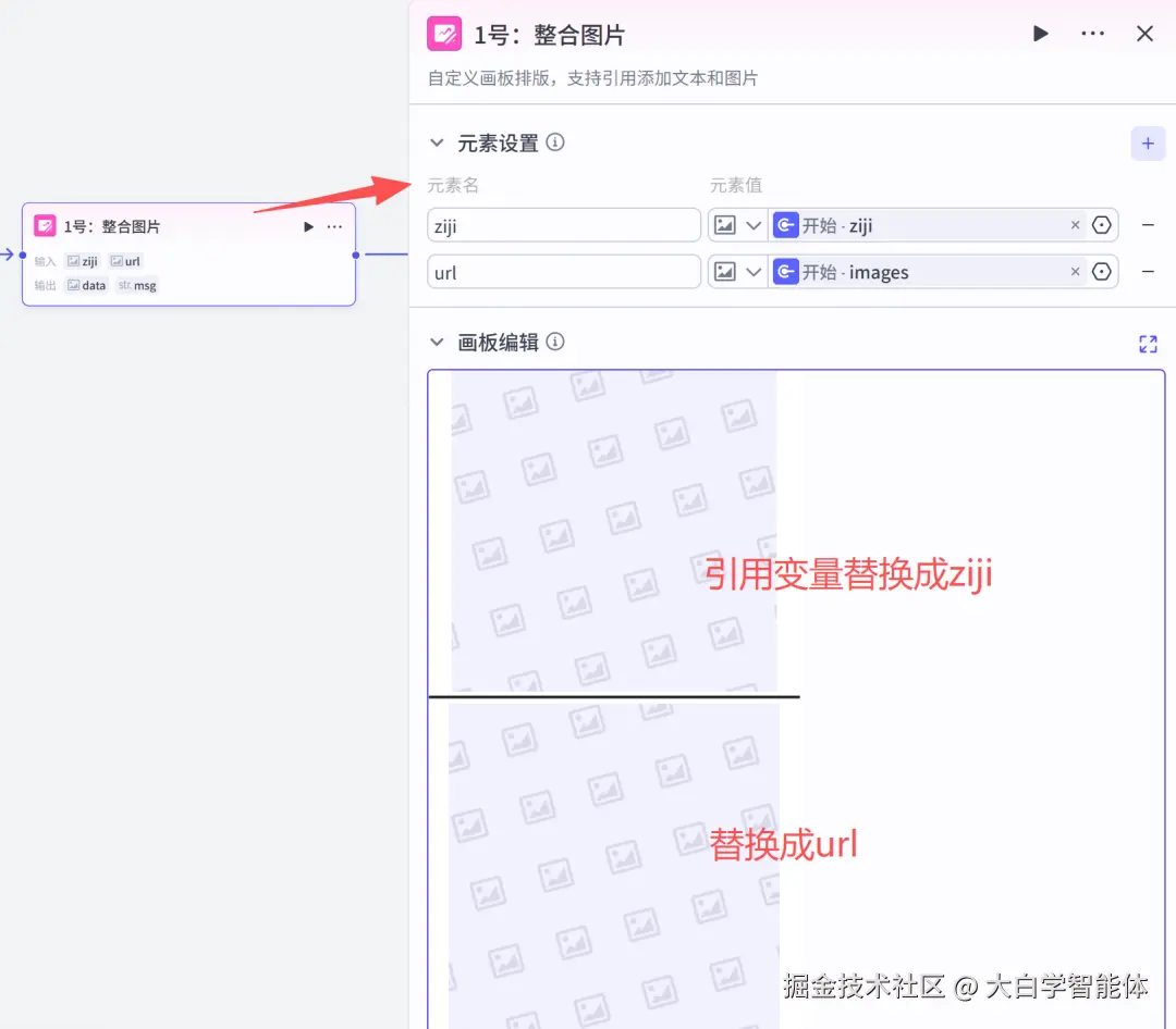 使用【画板】节点整合上传的2张图片。在画板编辑界面,用黑线隔开它们,并用具体的变量替换默认值。