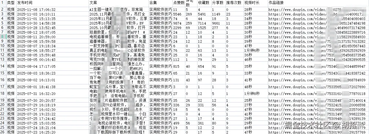 可以说这是我遇到过最强的抖音视频下载软件,它不仅可以批量解析下载视频,还把每个视频相关的数据都帮你下载下来,如:视频的标题文案、播放量、点赞、评论、以及每个视频平台给你推荐数量,它都可以帮你下载下来。