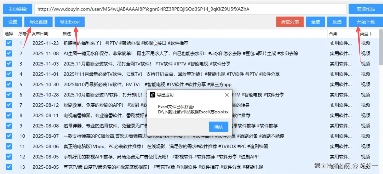 3、然后你就可以选择开始下载视频,导出直链接,或者导出Excel文件,如果需要视频相关的数据那导出Excel