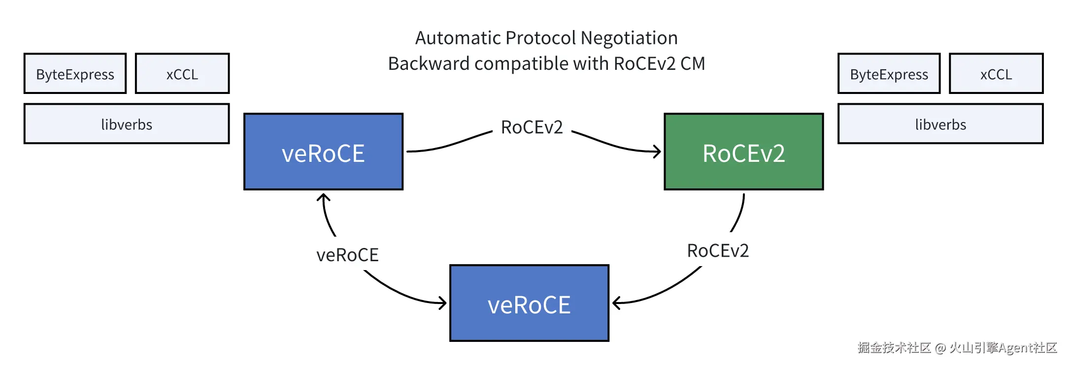 veRoCE注重兼容性和易用性,支持通用的verbs接口,消息语义与保序模型和RoCEv2一致,业务可以无缝切换。veRoCE的连接管理支持协议协商,与RoCEv2网卡互通时可自动回退到RoCEv2模式。该协议在与核心新功能无关的部分与RoCEv2保持完全一致,大大降低了迁移和部署的门槛。